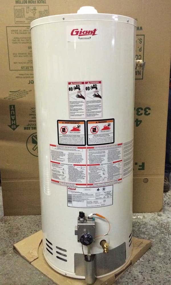 This recall involves atmospherically vented propane and natural gas water heaters in 30, 40, 50 and 60 gallon capacities. The recalled water heaters are white with a red “Giant” logo decal on the front. The water heaters have a nameplate near the gas valve with the model number, date of manufacture and serial number. Recalled water heaters have the following model number and have a serial number within the following ranges: